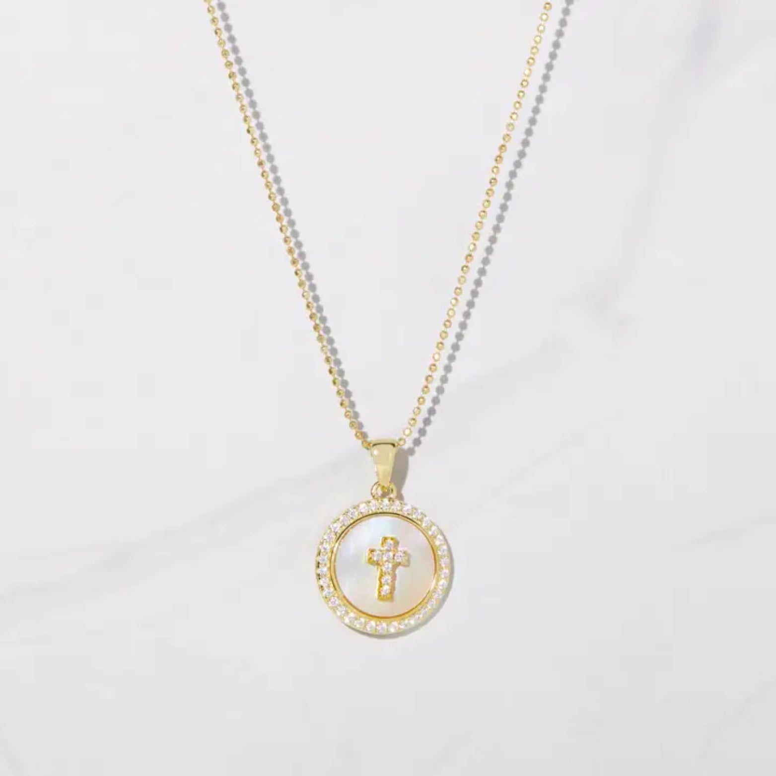 A beautiful and elegant cross medallion necklace set against mother of pearl and a cz stones surrounding the medallion. Very delicate and unique! Makes for a great gift as well!
